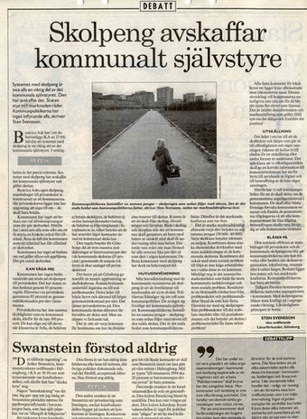 Artikeln i Kommunaktuellt är från 1994 och den är en replik på ett inlägg från Beatrice Ask där hon hävdade att skolans marknadsutsättning var en viktig del av det kommunala självstyret. Jag menade att det var tvärtom, marknadskrafterna skulle avskaffa det kommunala självstyret.